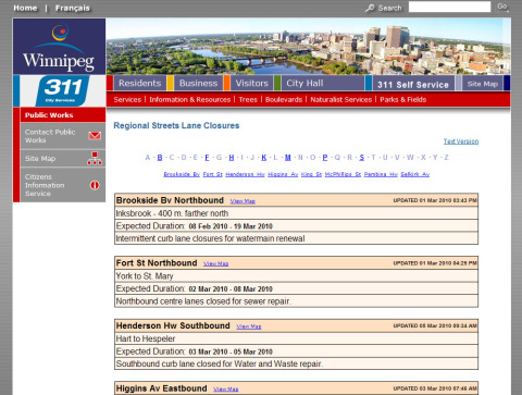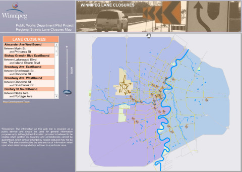 - Development of “Lane Closure Application” and associated administrative panel for the City of Winnipeg Public Works Internet web site.
